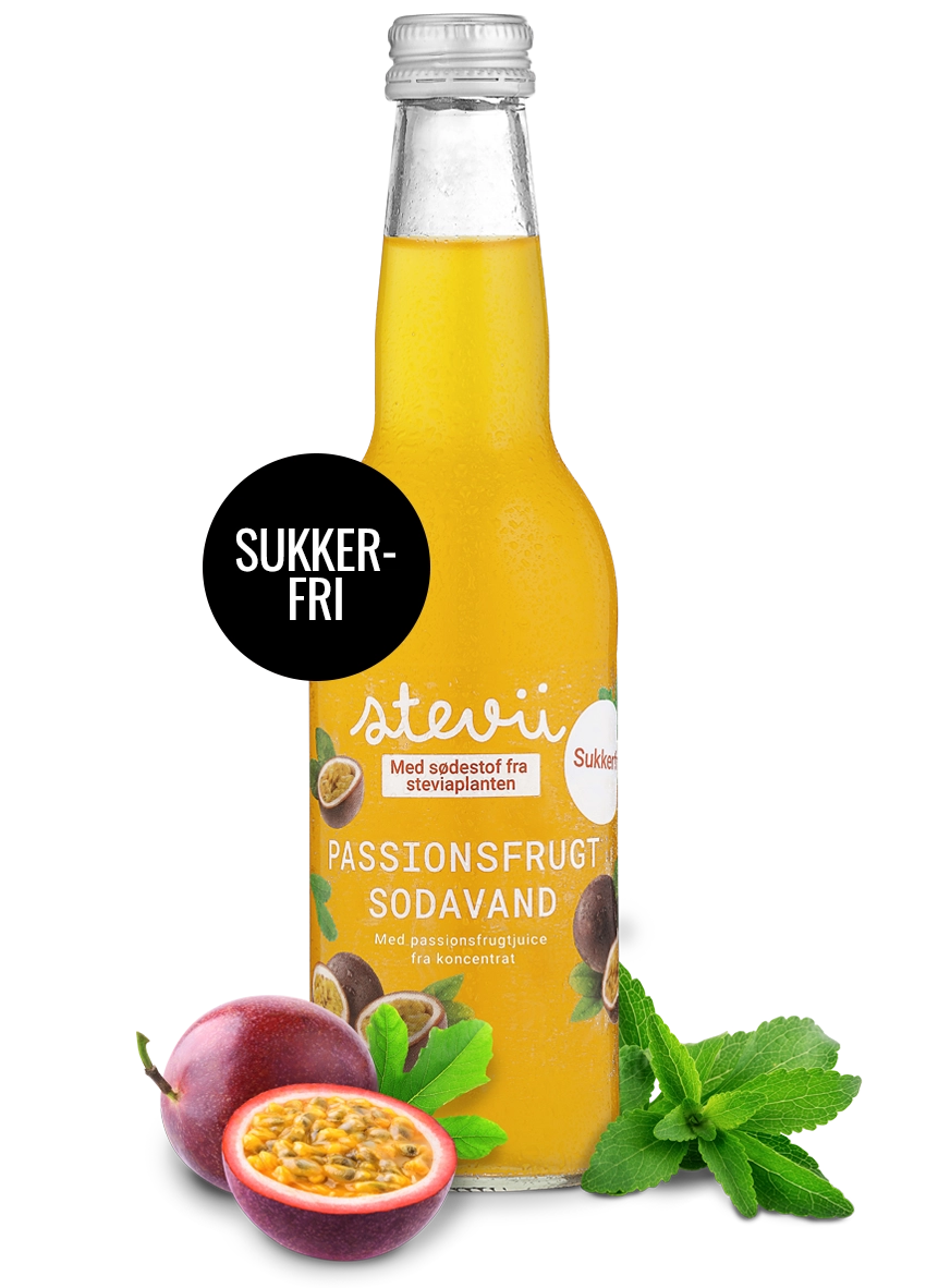 Kildevand tilsat kulsyre, 5 % passionsfrugtjuice fra koncentrat, naturlige aromaer, naturlig passionsfrugtaroma, farve (blandede carotener), antioxidant (ascorbinsyre), sødestof (enzymatisk fremstillede steviolglycosider).
